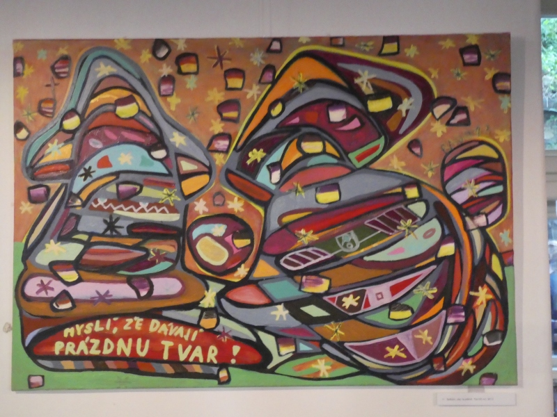 Přidanou hodnotu tvoří názvy obrazů: probouzejí fantazii a jsou samostatným příběhem bez ohledu na to, co se na obraze právě odehrává; Radomil je ne-vědomým pokračovatelem křížovnické školy čistého humoru bez vtipu. Jako příklad bych uvedl obraz, který namaloval pro svého přítele Mikoláše Chadimu a nazval jej „Gratulanti a zástup církevních restituentů“, případně „Ekonomika má skvěle našlápnuto“, obraz inspirovaný projevem tehdejšího předsedy vlády Bohuslava Sobotky, ovšem jak sám Radomil posléze naznal, jednalo se o „planý poplach“.