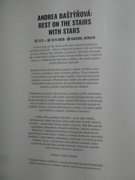 Do 12. 4. 2026 je v kulturním prostoru Jatka 78, Jateční 1530, Praha 7 (hala 7 a 8 Holešovické tržnice), přístupná velmi zajímavá a silná výstava Andrey Baštýřové: Rest on the Stairs with Stars.