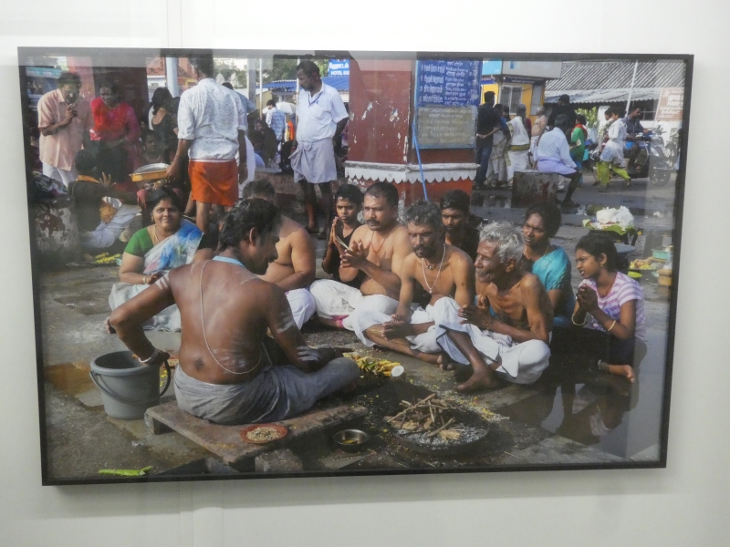 V prostoru před chrámem a v přilehlých ulicích probíhá několik rituálů současně. Na mokré zemi sedí rodiny v kruzích kolem kněží. Před sebou mají kovové talíře s rýží, květinami, vodou, sezamem a zbytky ohniště. Část lidí přišla přímo od moře nebo od chrámových studní, jsou bosí, s mokrými šaty a ručníky přes ramena. Kněží odříkávají mantry, dávají krátké pokyny. Jednotlivé skupiny fungují paralelně, jedna vedle druhé.