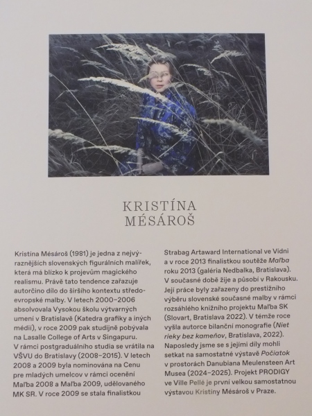 K malbě a obrazu se Kristína Mésároš dostala vlastní cestou přes studium grafických technik. Odtud její živý smysl pro formální experimenty s výrazovými prostředky malby. „Ve svých námětových okruzích se autorka dotýká přítomnosti člověka v průsečíku uplývajícího času. Konkrétní vzpomínky se tu prostupují se snovou realitou. Mystérium přítomnosti je tu deklarováno jako imaginární zázrak okamžiku, který opodstatňuje smysl lidské existence. Lidský pohyb není pouze gestem vitality, ale i sdíleným znakem pro aktivní přítomnost ve světě, který nás uvrhuje do pasivity konzumní recyklace a mentální rezignace. Obrazy Kristíny Mésároš plné jinotajného dění mají v sobě podmanivost dobrodružství, které zažíváme každý další den, v realitě všedních dnů i v nocích plných tužeb, snů a pootevřených horizontů. Odtud také název výstavy PRODIGY, ve smyslu zázraku či skrytého tajemství,“ vysvětluje kurátor výstavy Petr Vaňous.