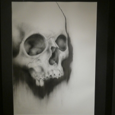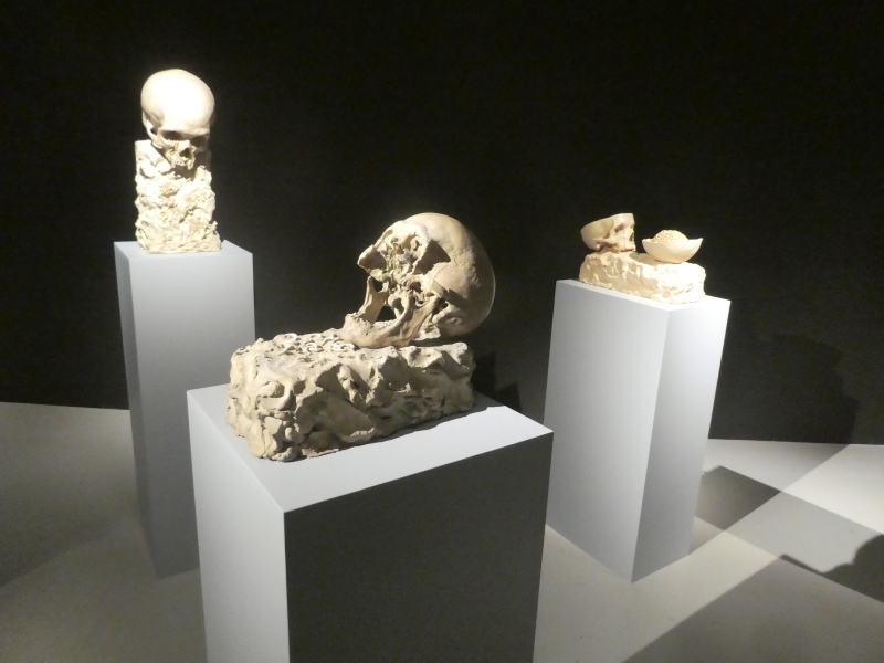 Černě vymalovaný prostor je zasvěcen nejvýmluvnějšímu motivu pomíjivosti – lidské lebce. Marek Škubal zde poprvé představuje kompletní sérii devíti keramických plastik, doplněnou pěti velkoformátovými kresbami: „Lebka mě dlouhodobě zajímá z hlediska symbolického, ale i pro své neobyčejné tvarové bohatství. Snažím o nalezení nových pohledů a struktur, které objevuji zejména tam, kde je lebka částečně destruována a kde se odhaluje fascinující architektura její vnitřní stavby. Používám zde velmi naturalistický způsob modelace, abych se co nejvíce přiblížil reálnému předobrazu –modeluji vždy podle skutečných ostatků – a mohl oslavit dokonalost, s níž je naše tělesná stavba stvořena. Plastiky lebek vždy doprovází motiv červů, kteří se na nich hemží, prolézají jejich prázdné oční důlky či bezkrevná ústa. Symbolizují zde jakési poslední průvodce na cestě těla, jsou ale též symbolem nového života, vyrůstajícího na troskách starého, na pokračování v jiné formě existence.“