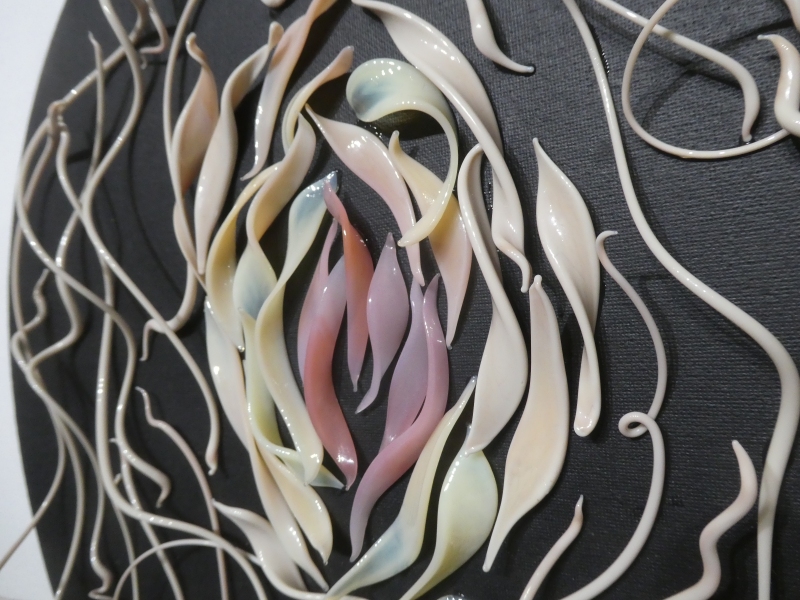 Petra Hamplová pracuje se sklem, které taví u sklářského hořáku. Tažením a tvarováním žhavého skla vytváří křehké křivky, které skládá do abstraktních kompozic. S odtahy pracuje jako s předem připravenou lineární kresbou, ze které vytváří prostorové koláže. Z tyčového skla také vine skleněné perle. Vinuté perle sestavuje do šperků. Když vytváří šperk, nepracuje podle návrhu, ale podle náhodného výběru, a to samé se odehrává při vzniku prostorových kreseb. „Tavení žhavé skloviny je krásný tvůrčí proces, který mě baví.“ Říká Petra Hamplová.
