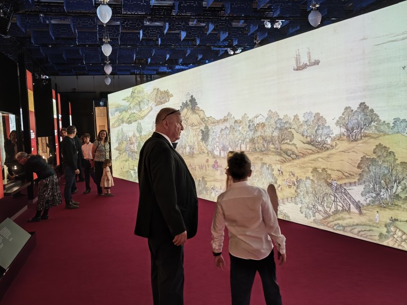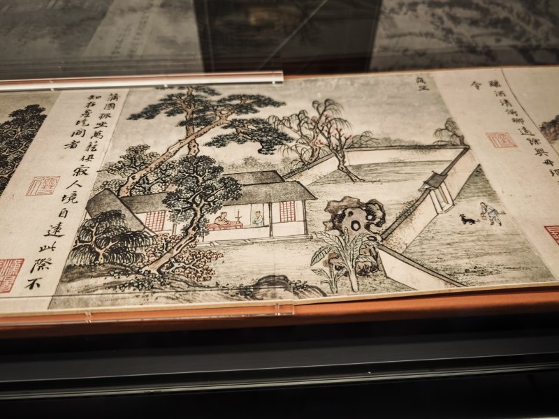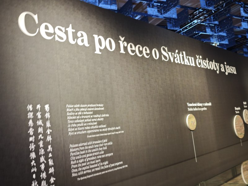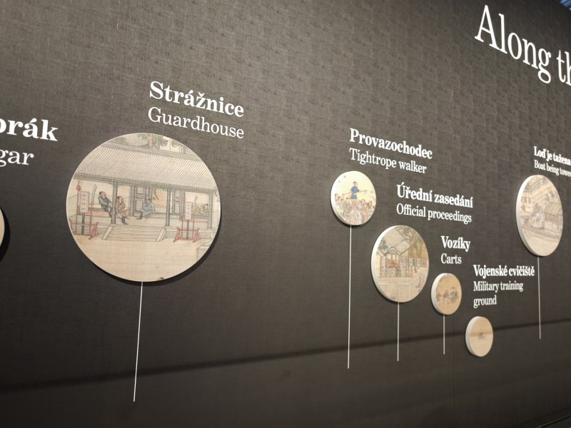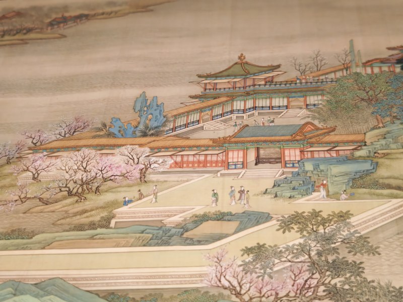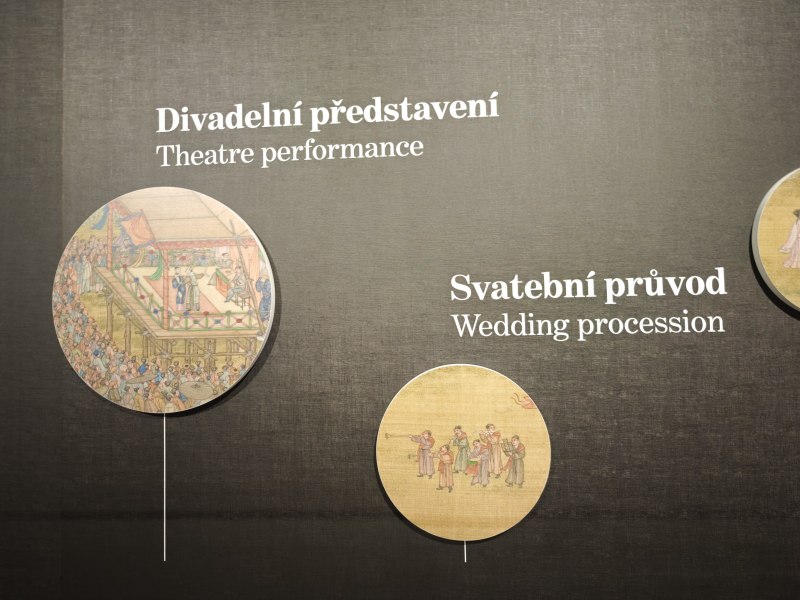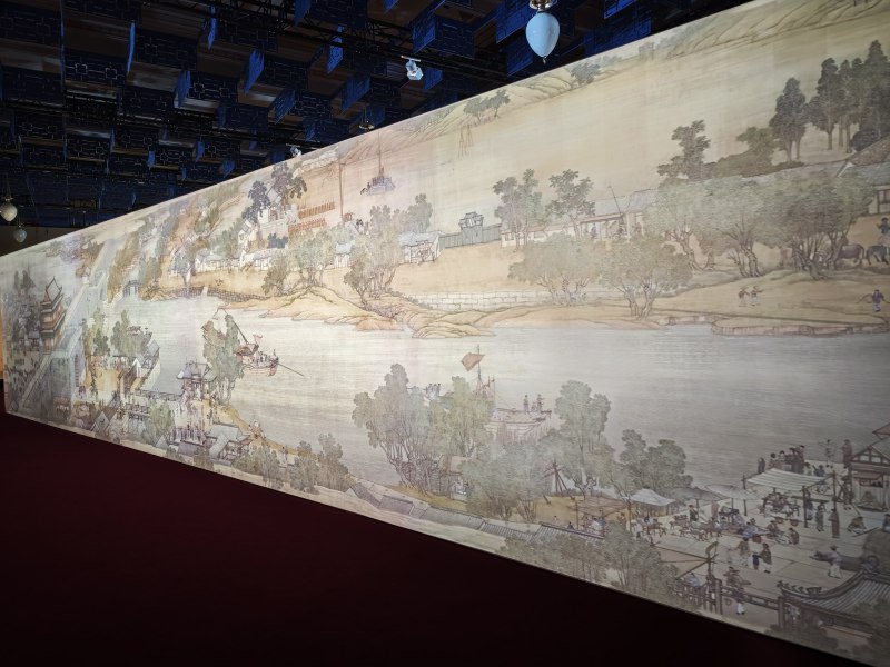 Doslova dechberoucím dojmem působí ve druhém výstavním sále dvojice svitků dlouhých 14 a 12 metrů. Téma elegantní život učence literáta ve staré Číně zachycuje svitek s názvem Vznešené zábavy ve stínu stromů ze 16. století, který doplňuje psací náčiní, takzvané Poklady studovny. Každodenní život zosobňuje svitek Cesta po řece o svátku čistoty a jasu. Svitek vás vtáhne do tehdejšího každodenního života staré Číny, prostřednictvím velkoformátové rozpohybované animace můžete doslova procházet městem a nechat se pohltit atmosférou tehdejšího městského ruchu. Setkejte se s trhovci prodávajícími ženšen nebo se vznešenými dívkami, které zvědavě pozorují z houpačky dění za zdmi zahrady, zastavte se u duhového mostu, kde proudí lodě, lidé i zboží.