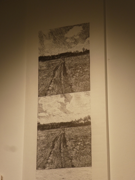 Autorka uvádí: Soutisk grafických matricí z cyklu „Cesta“ zobrazuje úsek z cesty, kterou jsem v pravidelných cyklech absolvovala během pandemických let. Jezdila jsem na kole svůj obvyklý okruh, kde se stejná ubíhající krajina den za dnem měnila i zůstávala potřebnou jistotou v nejisté době. Detailní černobílé linoryty jsou portréty této ubíhající krajiny, vytvářející novou individuální podobu, kterou si každý utváří sám. Minimálně měnící se cesta a její stylizované monochromatické vyobrazení nabízí divákovi prostor k vlastnímu zamyšlení a hledání osobní perspektivy.