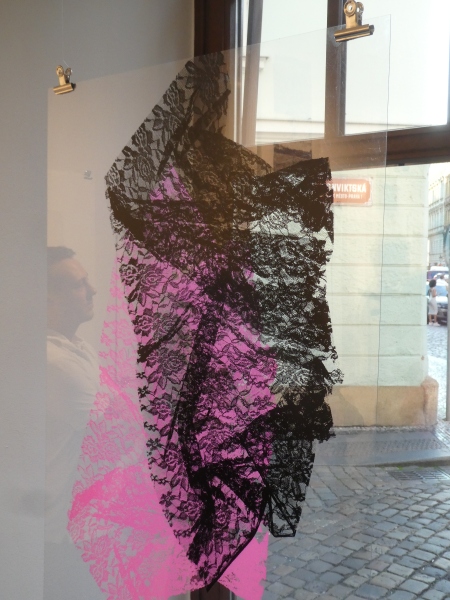 Autorka uvádí: Grafika Vrstvy vznikla technikou sítotisku, při které jsem experimentovala s možnostmi vyvolávání obrazu do síta. Zaměřila jsem se na zachycení krajky a hledala způsob, jak ji prostřednictvím tisku zvěčnit. Koncept díla spočívá v uchování vzpomínek spojených s materiálem. Látky, krajky nebo závoje v sobě často nesou citovou hodnotu a mohou připomínat důležité okamžiky, které se postupem času vytrácejí. Prostřednictvím tisku jsem chtěla tento pomíjivý vztah proměnit v trvalý obraz, který uchová nejen vizuální podobu materiálu, ale i vzpomínky s ním spojené. Dílo je tvořeno dvěma vrstvami tisku, přičemž jedna se nachází na averzní straně plexiskla a druhá na reverzní. Použití odlišných barev, kde černá evokuje strukturu krajky a křiklavě růžová vytváří její pomyslný stín, umožňuje vznik hloubky a jemných optických iluzí. Díky tisku na průhledný materiál může divák obraz zkoumat z obou stran, vnímat jeho proměnlivost a objevovat detaily, které vznikají překrytím motivu.